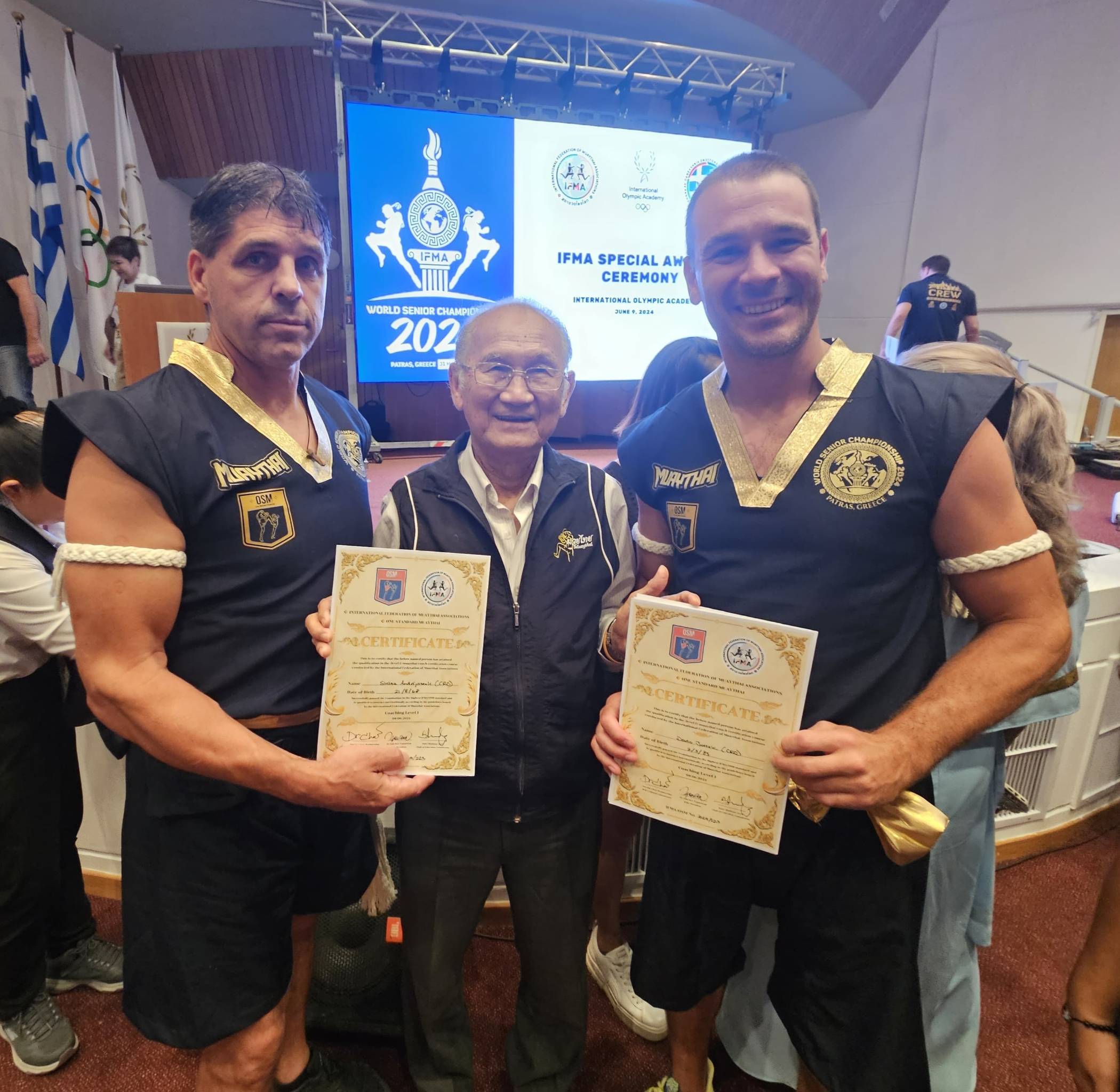 Na specijalnoj ceremoniji u Olimpiji, predsjednik svjetske krovne Muaythai organizacije IFMA-e dr. Sakchye Tapsuwan dodijelio je trenerske licence našem Mariju Košaru, Siniši Andrijaševiću i Dariju Jurišiću.